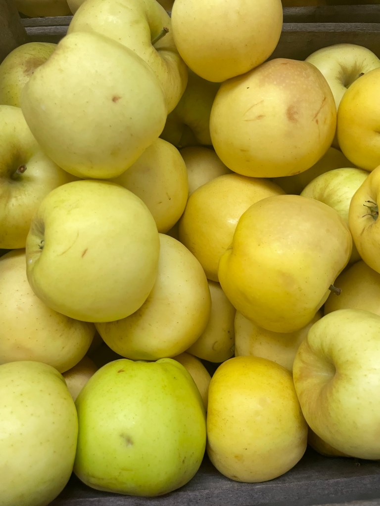 Grimes Golden: Grimes Golden is crisp and sweet – however, the sweetness is richer than in Golden Delicious, and most tasters agree that Grimes Golden has the superior flavour. There’s a hint of rich spiciness in Grimes Golden which is completely absent in Golden Delicious